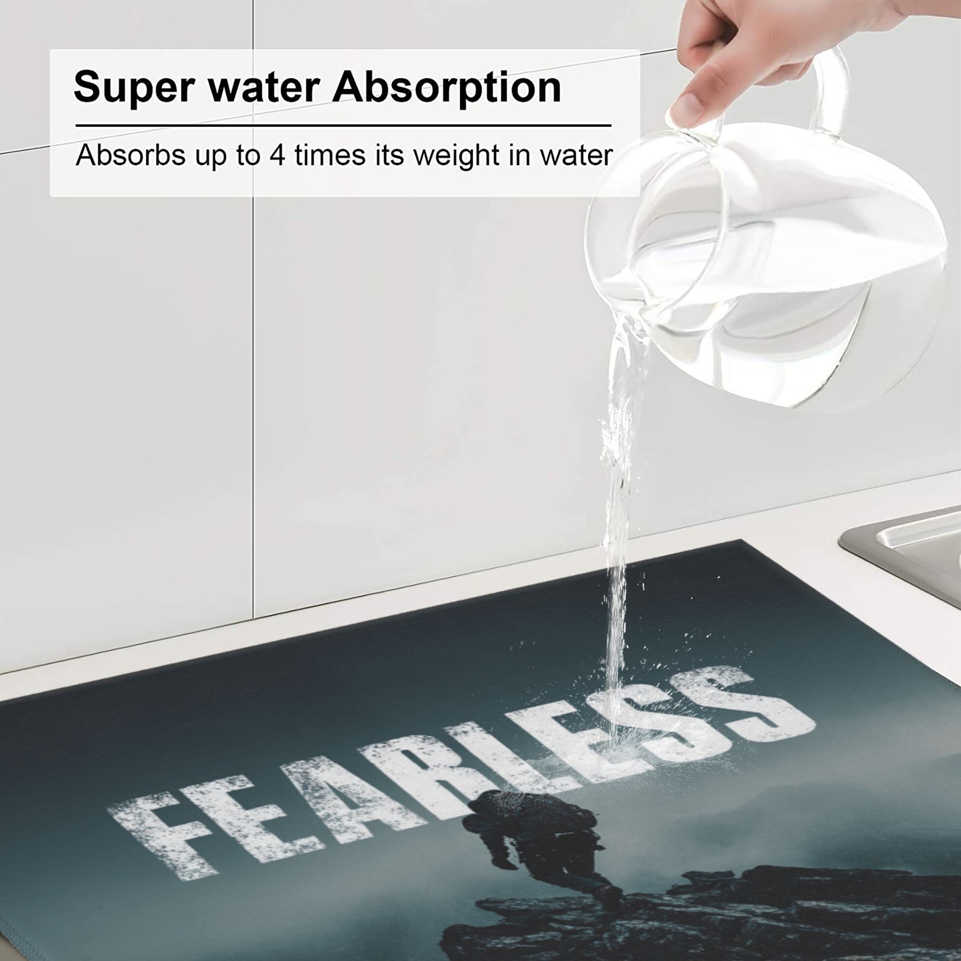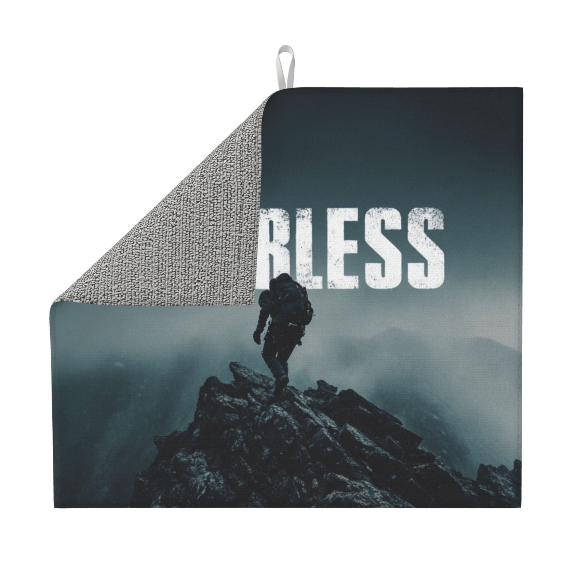 Infuse your kitchen with a sense of grit, adventure, and unshakable courage. This drying mat features a bold design showcasing a lone mountain climber ascending a rocky peak, framed in a misty mountain background. The bold white text “FEARLESS” adds both visual impact and motivational energy, making this more than just a kitchen accessory—it’s a daily reminder of bravery.