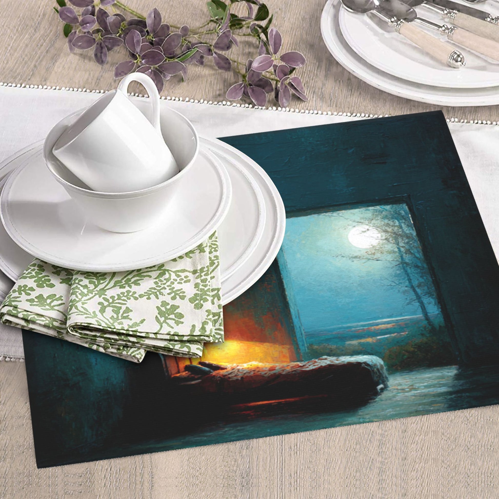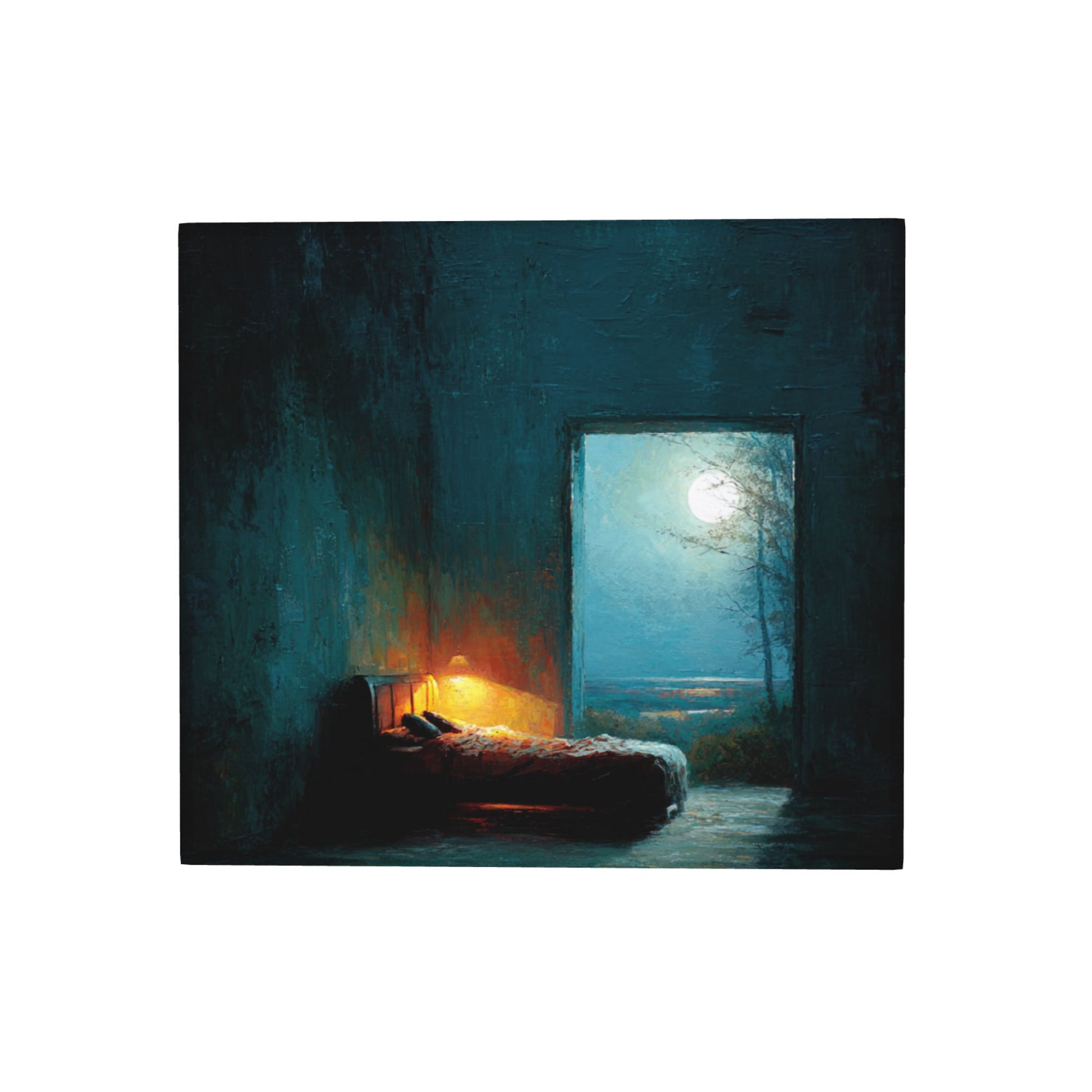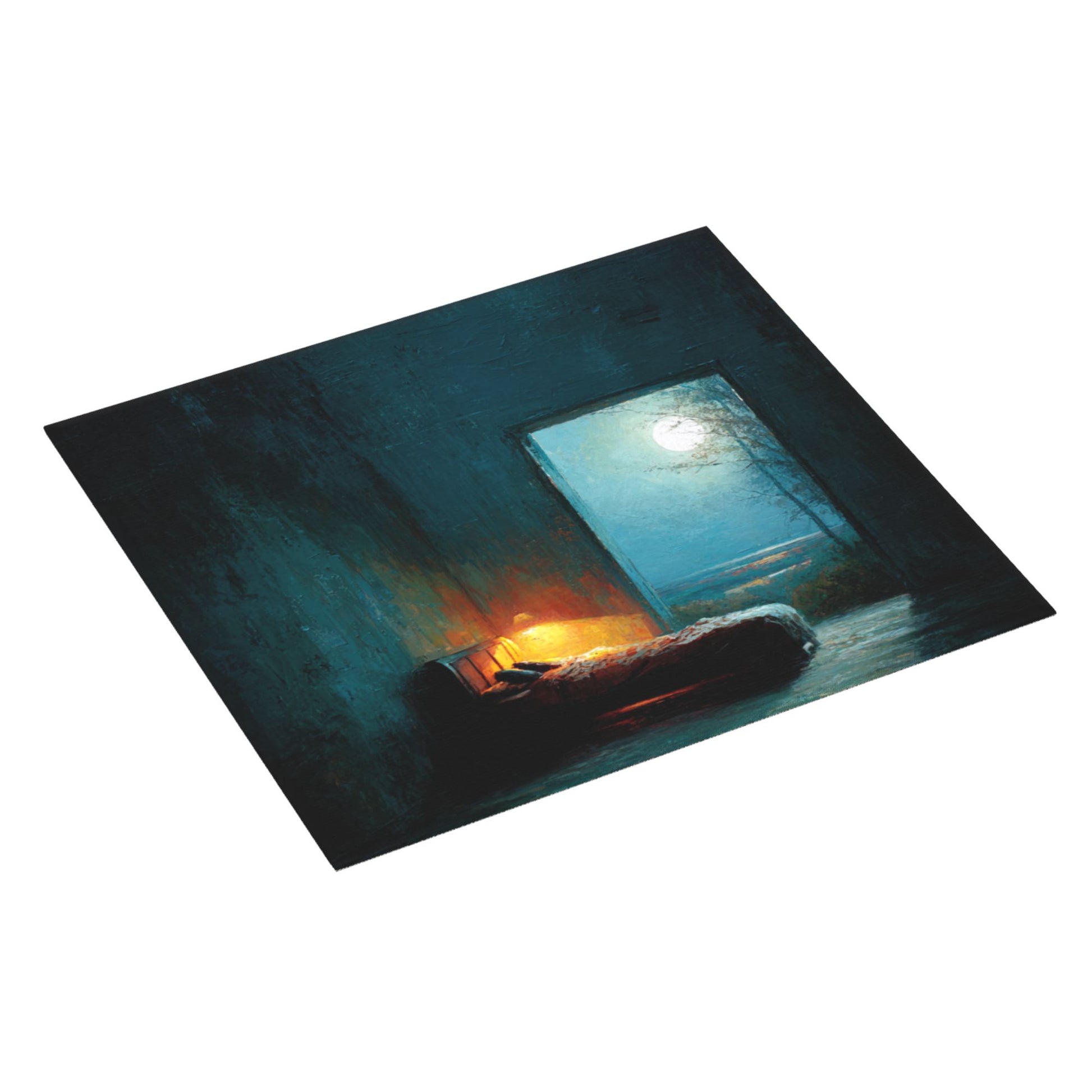 The artwork evokes a dreamy, painterly atmosphere: a dimly lit bedroom illuminated by a soft bedside lamp, open to a moonlit night beyond the door. With gentle brushstroke textures and rich midnight hues, the design turns a simple mat into a poetic addition to your kitchen decor.