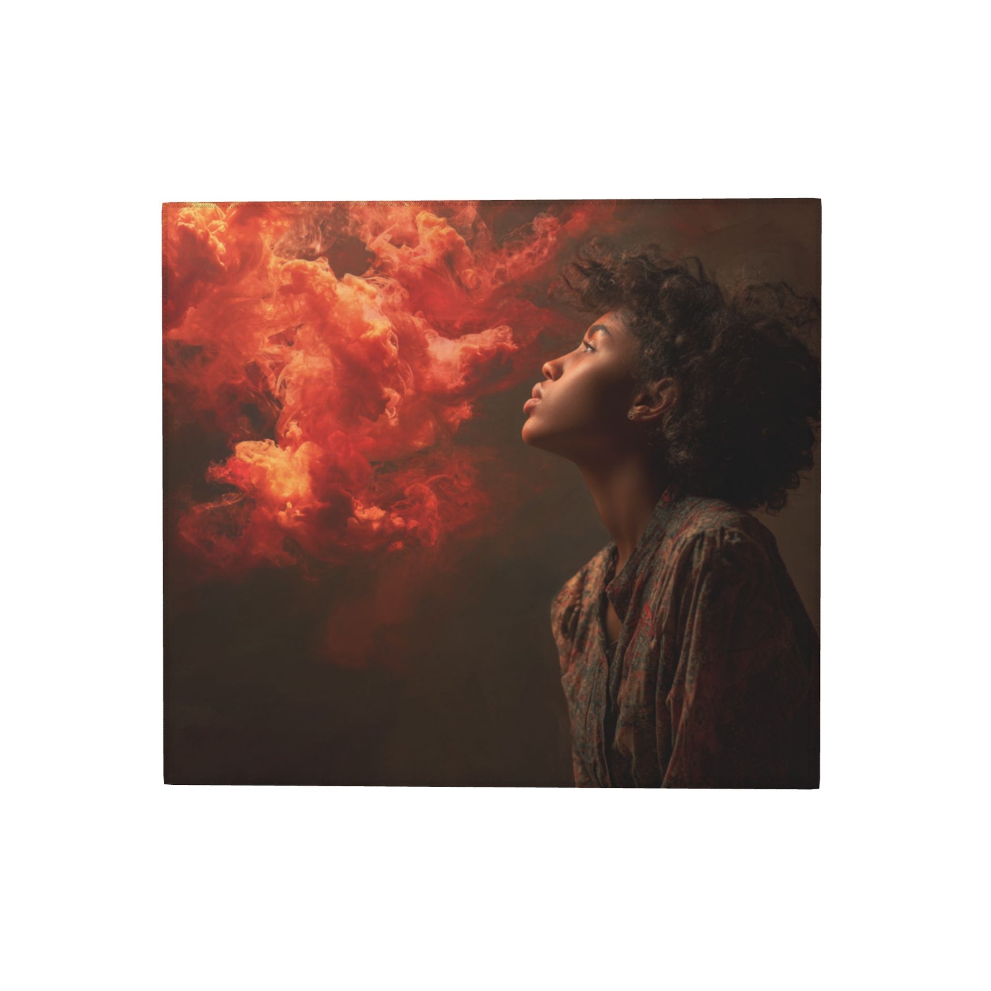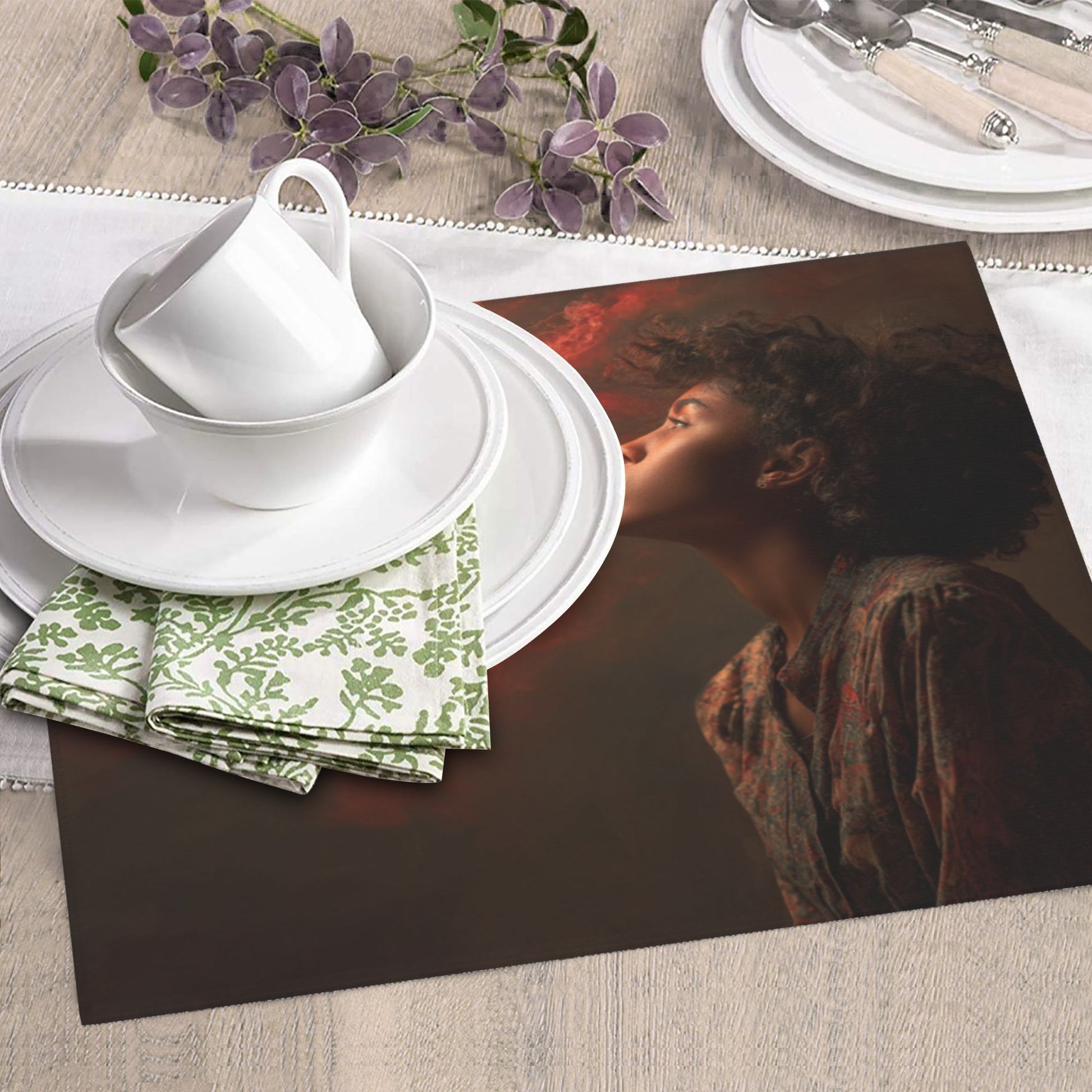 The artwork features a contemplative side profile of a woman, bathed in dramatic red mist. This cinematic and atmospheric design exudes both stillness and strength, adding a touch of soulful visual poetry to your countertop. The warm tones and thoughtful composition transform this mat into more than a utility—it becomes part of your interior expression.