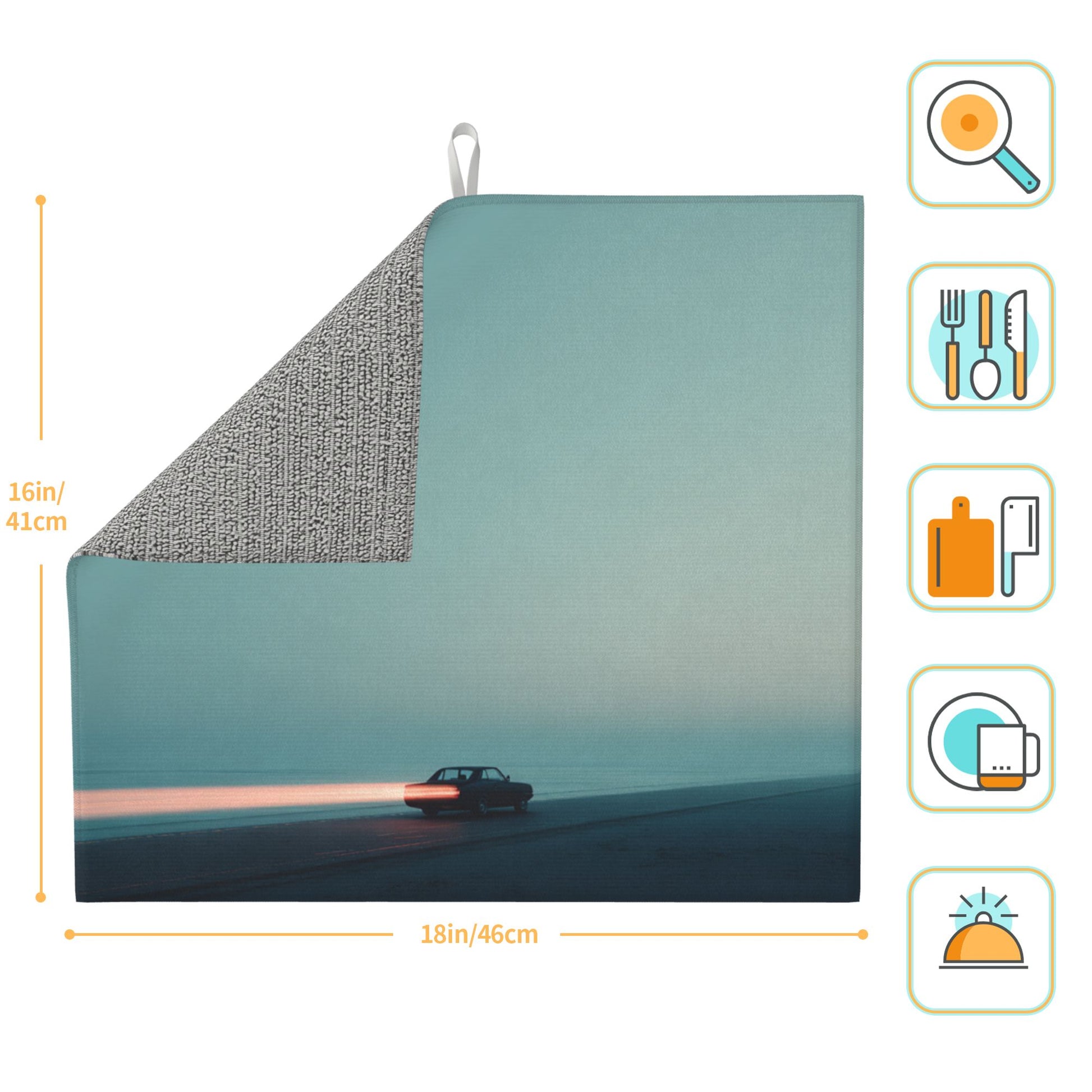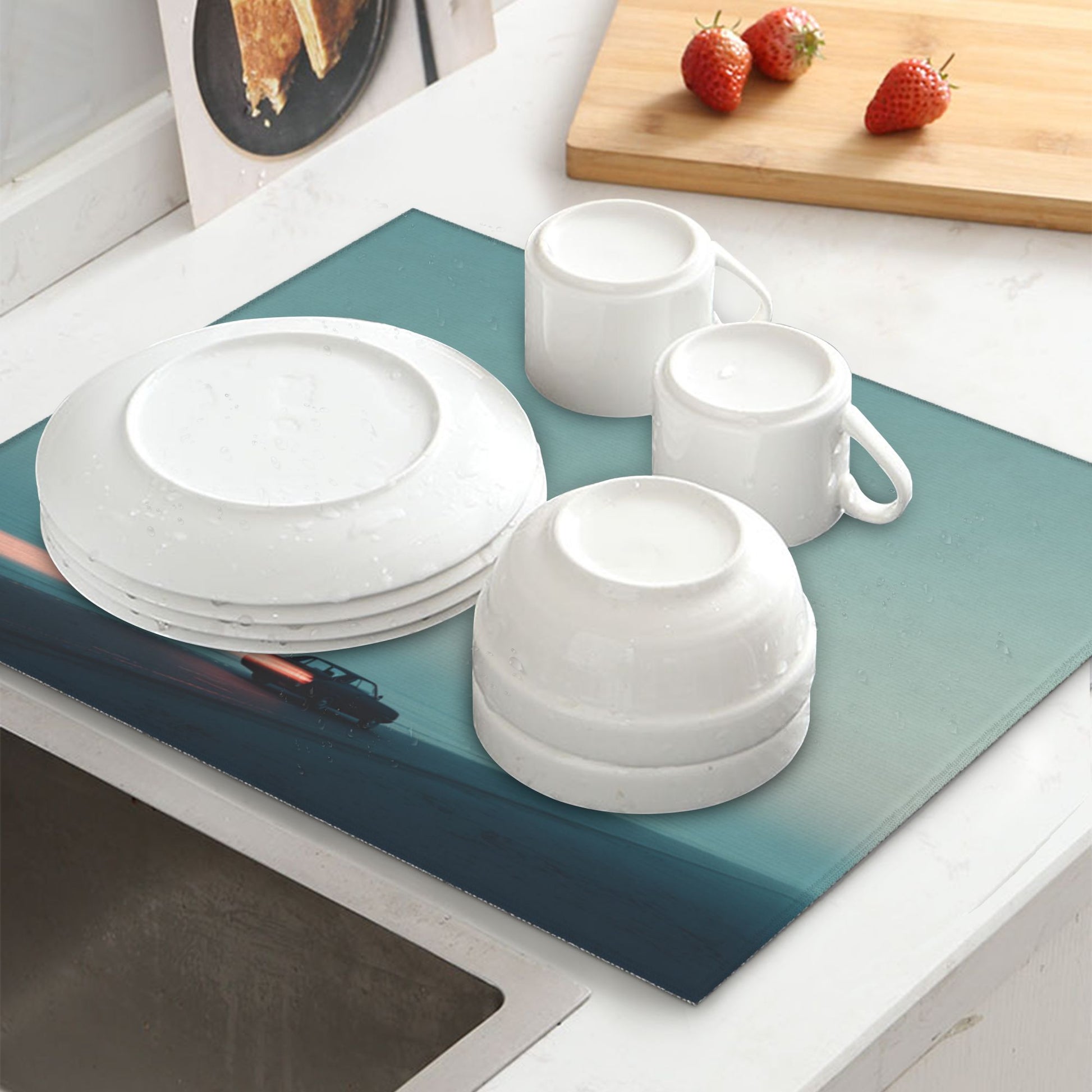 Bring a serene and cinematic touch to your kitchen with this “Seaside Twilight Car” drying mat. Featuring a minimalistic photograph-style design of a solitary car driving along a coastal road under a fading blue sky, it captures the stillness and beauty of twilight. The muted tones and artistic atmosphere make this mat more than a kitchen essential—it’s a statement of style.